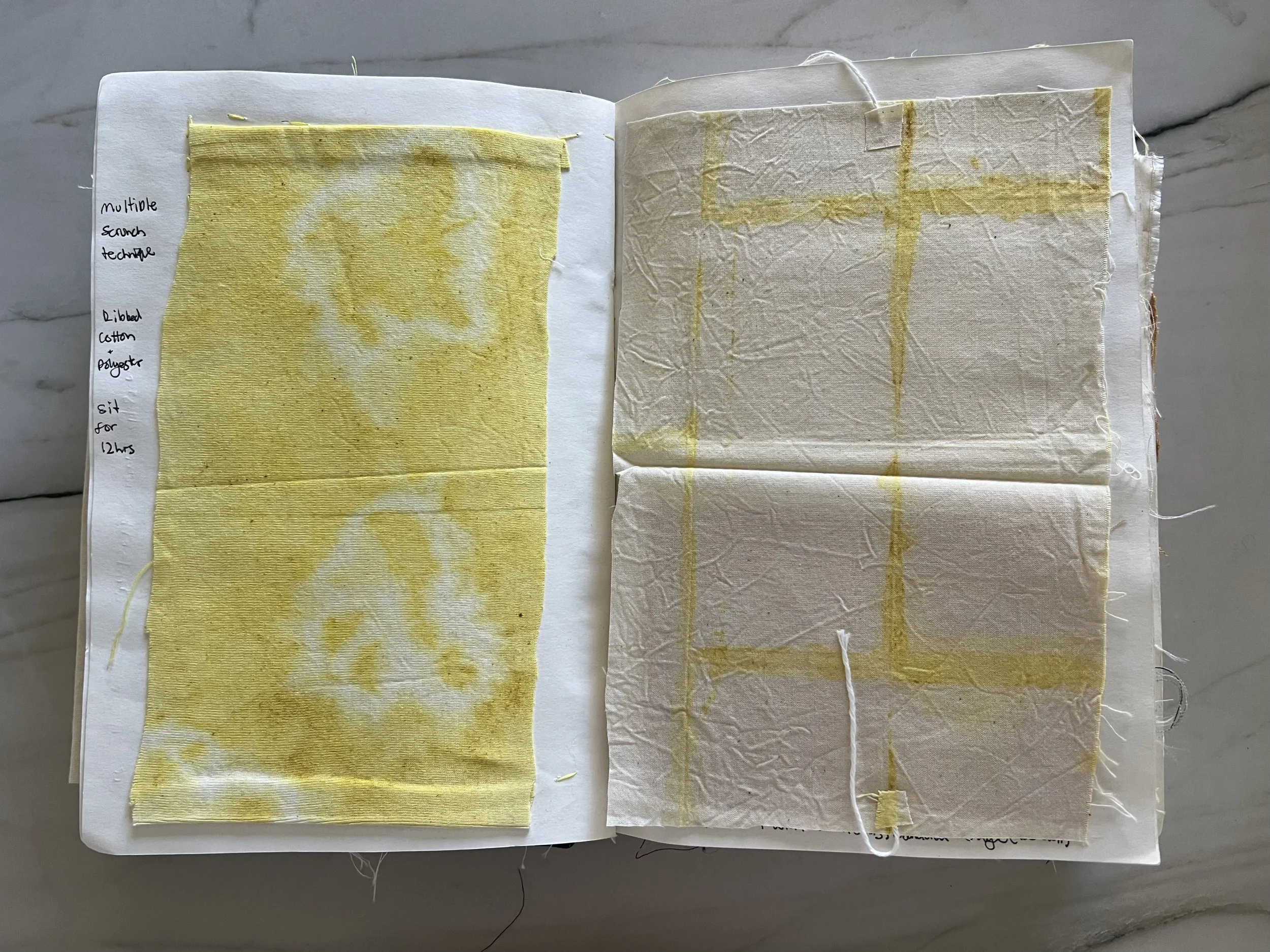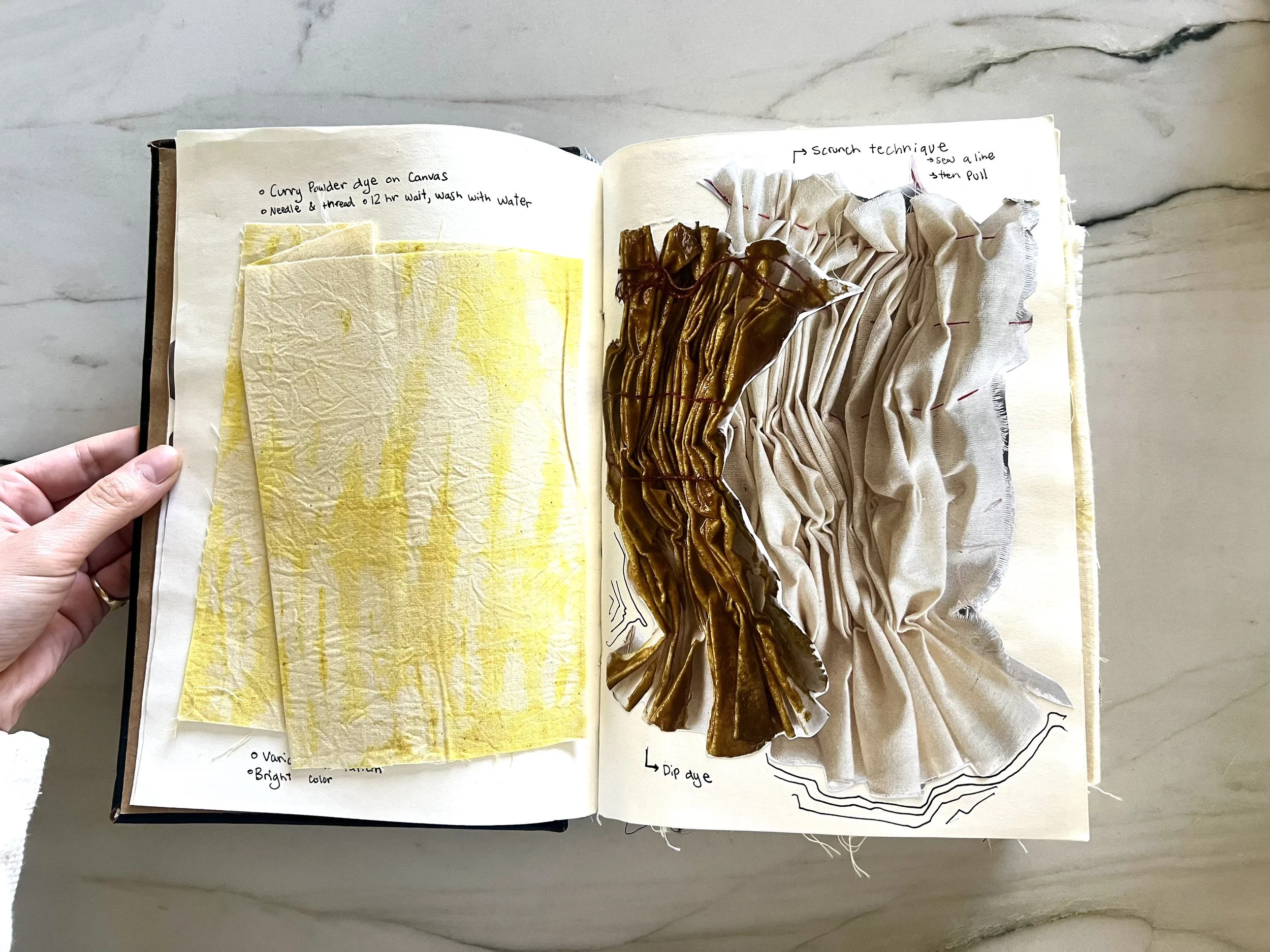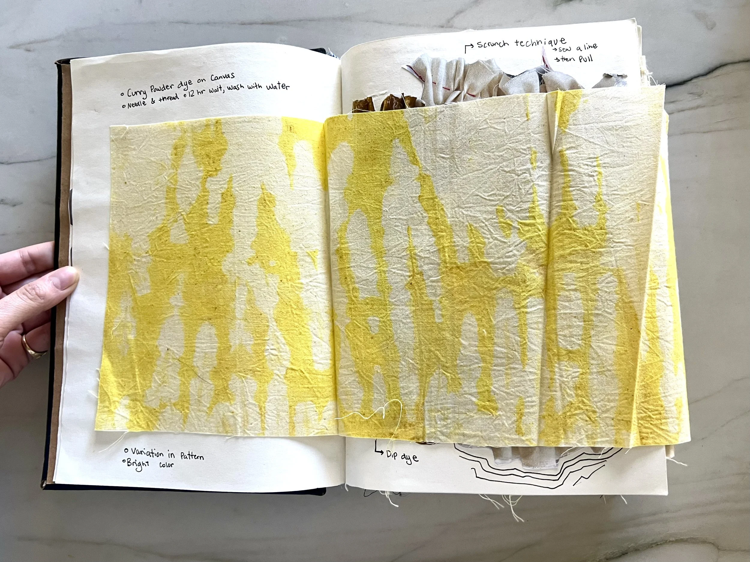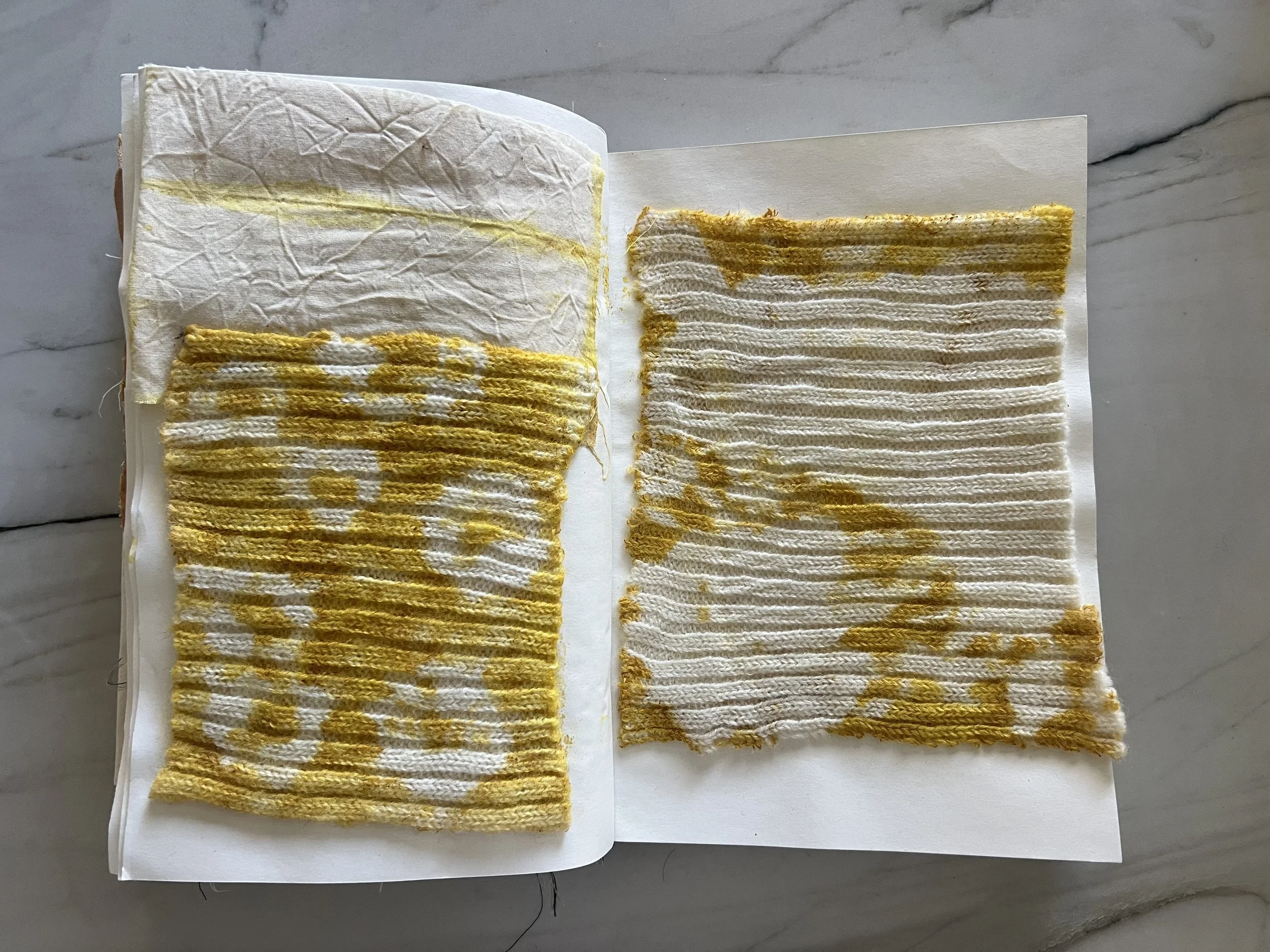A Textile Process book where I explore dying sustainbility through different natural dye techniques using the spice, Tumeric.
